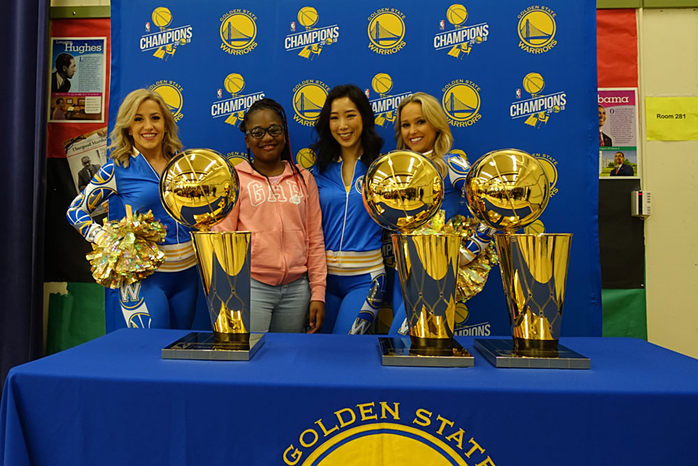 Over 20 students at Garfield Elementary School received new glasses and got to try them out in a unique way – posing with the the Larry O’Brien NBA Championship Trophy and Golden State Warriors Community Ambassador Adonal Foyle. The event celebrated a continuing partnership between the Warriors Community Foundation and non-profit provider Vision To Learn, now in its fourth year providing free eye exams and glasses to students in need throughout the Bay Area.
